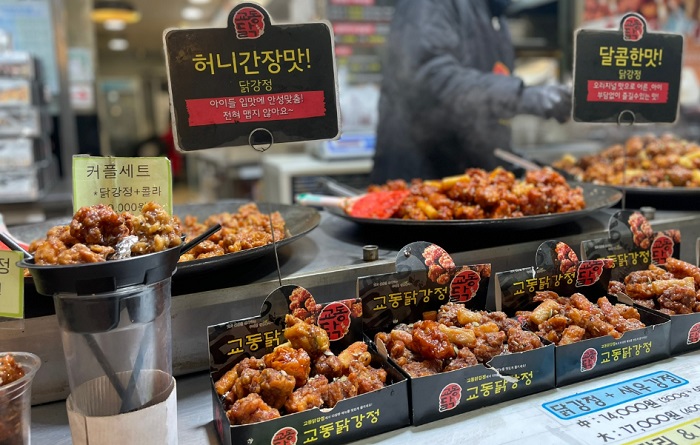 with lots of delicious food. One of the most popular dishes to try are dakgangjeong, which are various kinds of fried chicken bites.