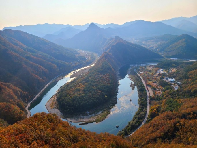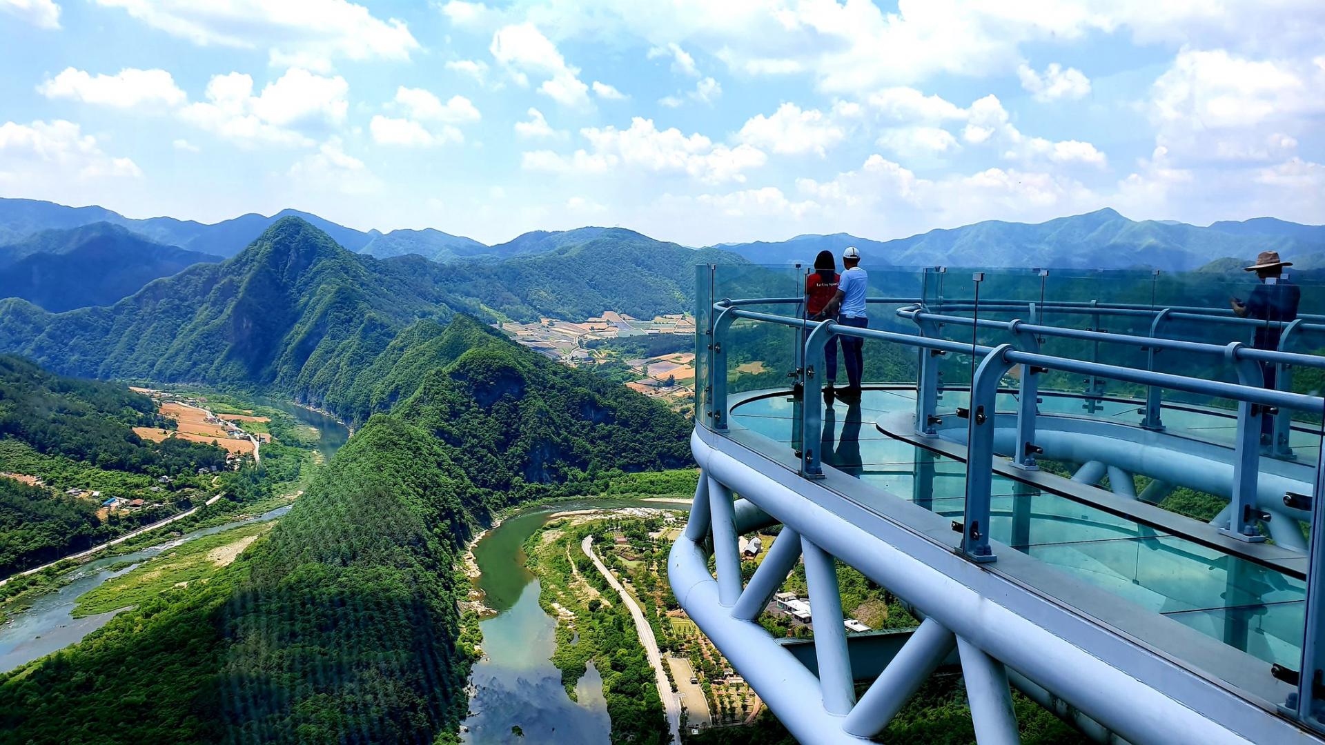 This Skywalk with breathtaking views of the shaped like the Korean peninsula by the Donggang River.