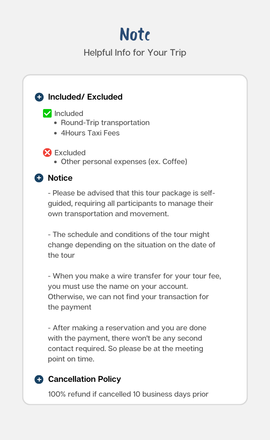 *Please be advised that this tour package is self-guided, requiring all participants to manage their own transportation and movement.